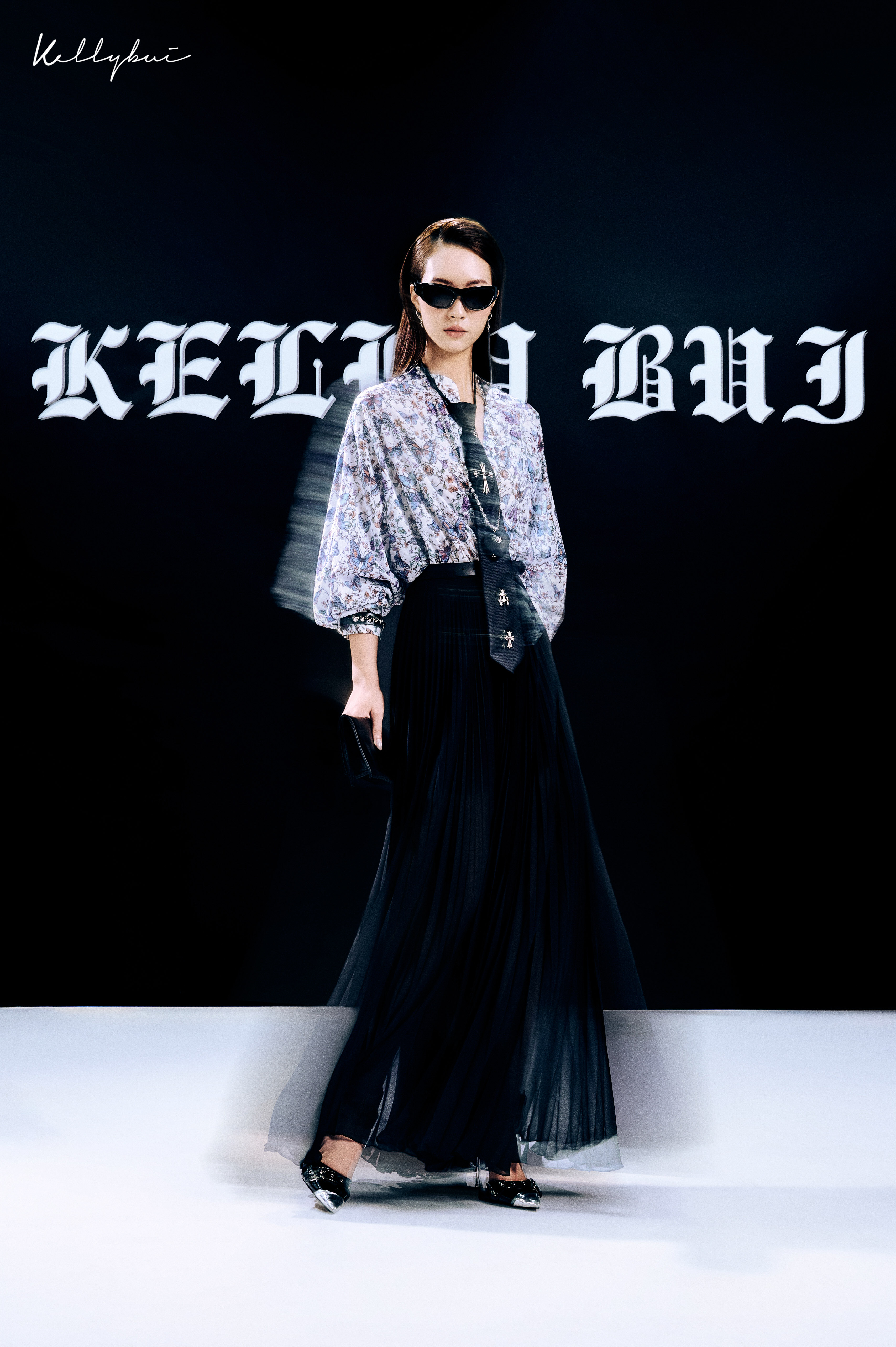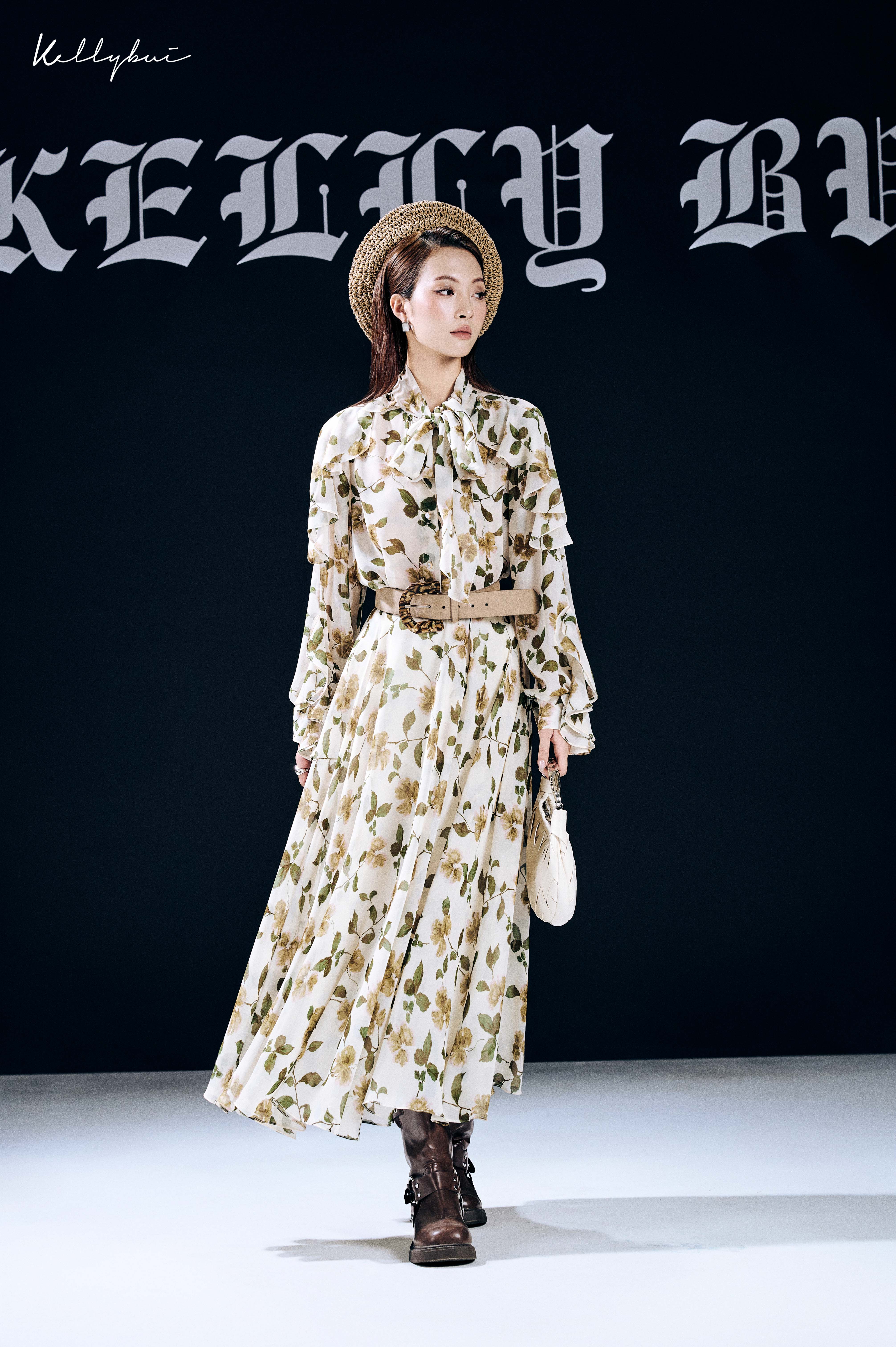 Điểm nhấn hoa lá được xử lý bằng những kỹ thuật in, thêu và sắp đặt bất đối xứng, như những cơn gió thu nhè nhẹ khẽ lướt qua bề mặt vải để tạo nên sự chuyển động uyển chuyển. Song song đó, chất liệu cao cấp cũng được KellyBui lựa chọn kỹ lưỡng: thô sang trọng và chiffon mềm mại. Sự kết hợp hài hòa giữa bề mặt chất liệu thô mộc và mịn màng gợi nên cảm giác đối lập đầy dụng ý, như bản giao hưởng của mùa thu – nơi thiên nhiên và thời trang cùng hòa nhịp.